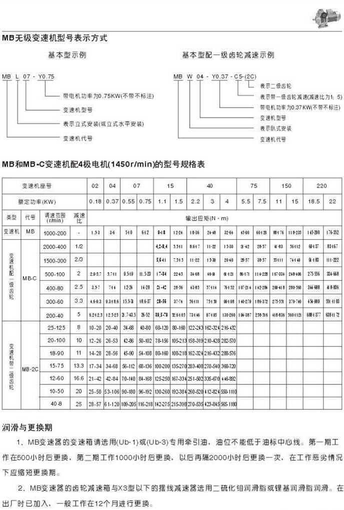 MB無級變速機型號表示法MB和MB-C變速機配4極電機(1450r/min)的型號規格表潤滑和更換期