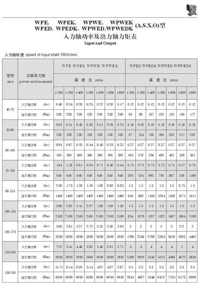 WPE,WPEK,WPWE,WPWEK,WPED,WPEDL,WPWED,WPWEDK(A,S,X,O)型入力軸功率及出力軸力矩表